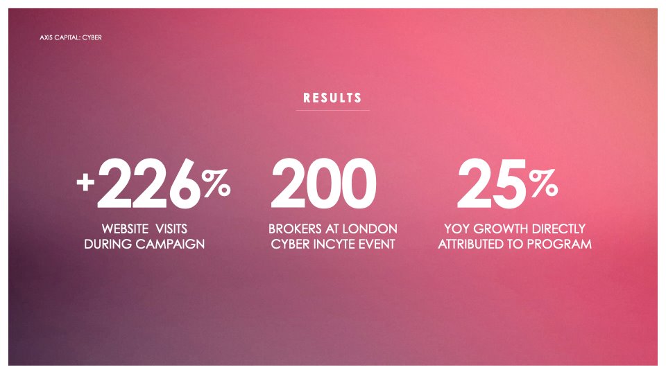 And to generate some buzz among insurance brokers, we helped AXIS organize a series of world-class events branded the AXIS Cyber INCYTE conferences.