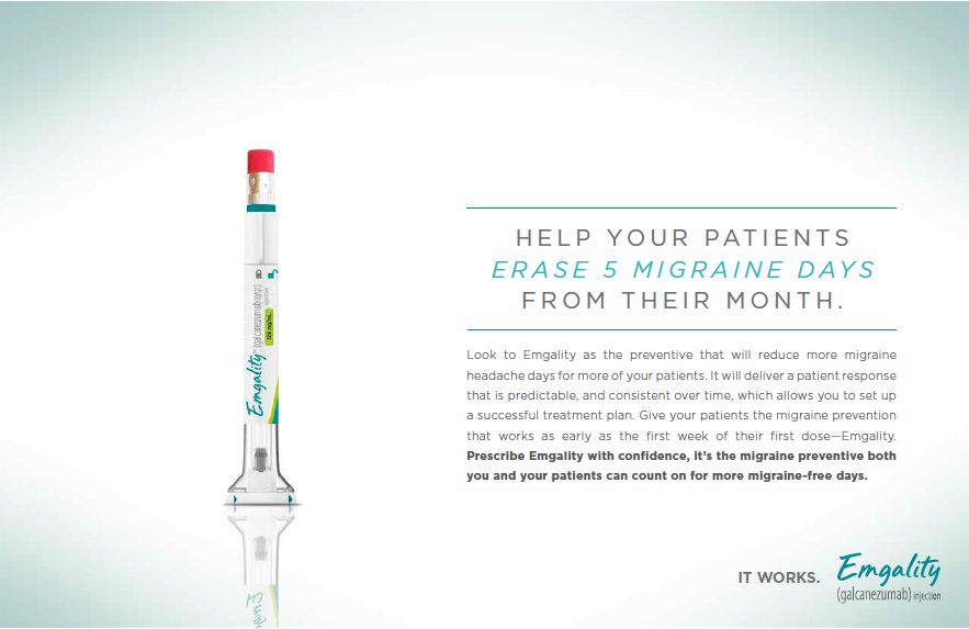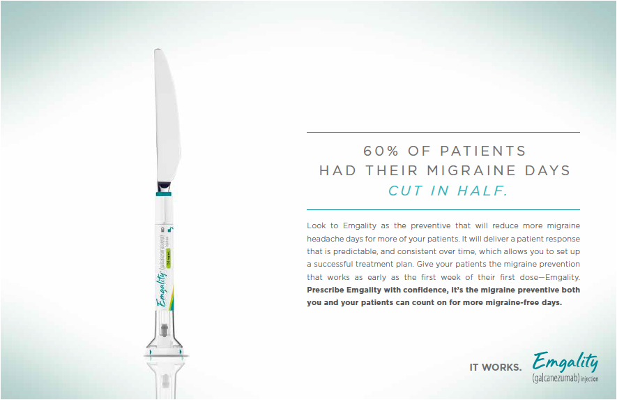 Migraine prevention is a crowded category with multiple new CGRP entrants competing for the same prescribers simultaneously. Neurologists and headache specialists are skeptical of efficacy claims they’ve heard before. The creative challenge was to cut through category noise with HCP print that made Emgality’s clinical data — specifically its speed of onset and the magnitude of migraine day reduction — feel genuinely differentiated rather than interchangeable with competitors.